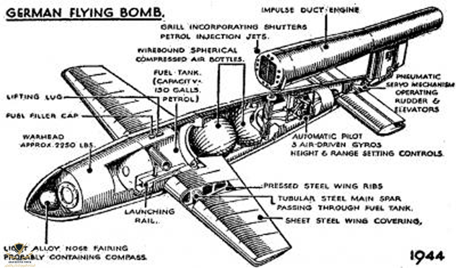 صاروخ كروس V1 الألماني و يسمى بالقنبلة الطائرة أيضا اول من قصفت به المواقع البريطانية فكانت اول ضربة لجسر سكة القطار في لندن في Grove Mile End.