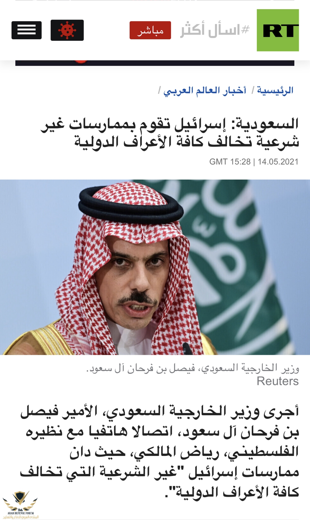 وأفادت وكالة "واس" السعودية الرسمية، في بيان، بأن بن فرحان أكد خلال الاتصال "إدانة المملكة للممارسات غير الشرعية التي تقوم بها سلطات الاحتلال الإسرائيلية، وضرورة الوقف الفوري لأعماله التصعيدية التي تخالف كافة الأعراف والمواثيق الدولية".