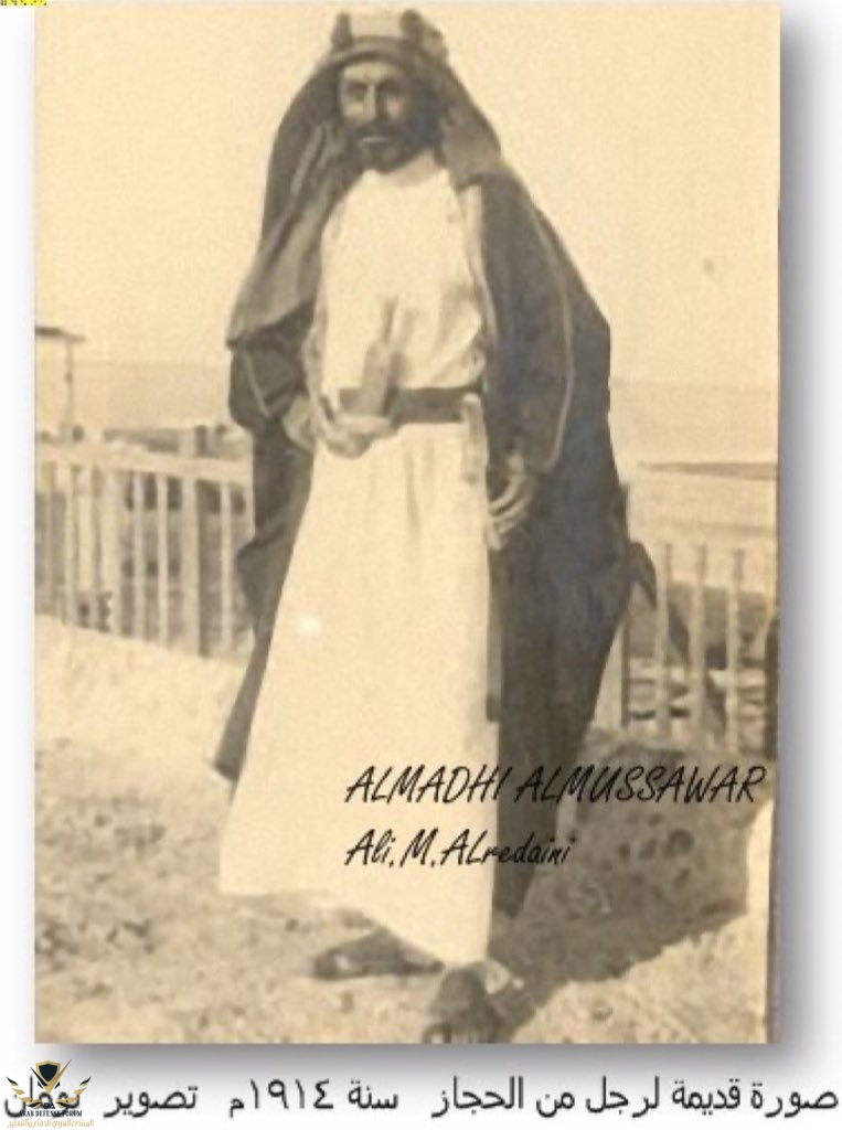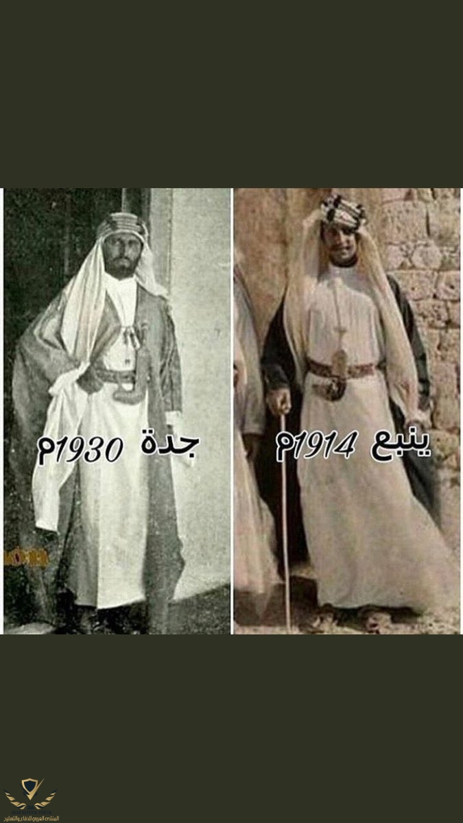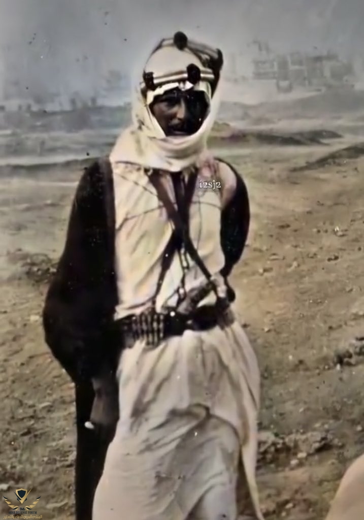 الصوره الثالثه من اليمين الاقرب (وفي نظري القبايل اللي هي الاغلب تميزت بالعقال المقصب والغطره عكس اللاجئون والمستوطنين السبب قرات في الوثائق العثمانيه نسبة القبايل في الحجاز 97% و٣٪؜ جاليات من مصر والشام واليمن وافريقيا وتركيه واسيا ورابطات تجاريه افريقيه واسيويه هكذا ذكرو جاليات (وليس اهل الارض) محد اعطاهم ارض الا الملك عبدالعزيز
