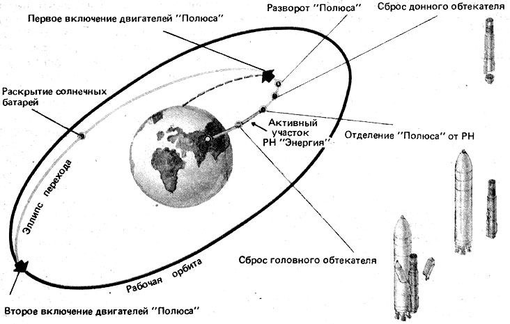 بعد دقائق قليلة من الإقلاع ، انفصل Skif-DM إلى الانفصال عن Energía وعمل دوران معقد بزاوية 180 درجة لوضع وحدة الدفع FSB خلف المجمع وبالتالي تنفيذ الإدراج المداري.