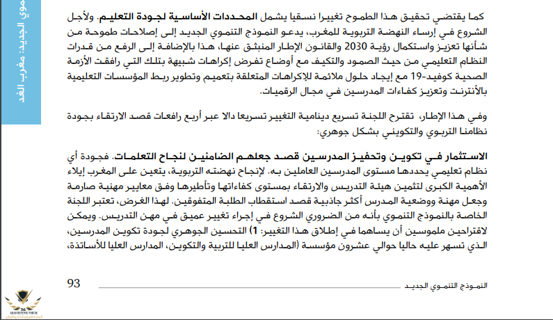 - تحسـين جـودة التعليـم بشـكل جوهـري وإعـادة وضـع المدرسـة العموميــة فــي صلــب المشــروع المجتمعــي للمغــرب. فــي أفــق 2035 ،يجــب أن يمتلــك أزيــد مــن 90 %مــن التالميـذ المهـارات المدرسـية األساسـية عنـد نهايـة مرحلـة التعليـم االبتدائـي، مقابـل أقـل مـن 30 %حاليـا.