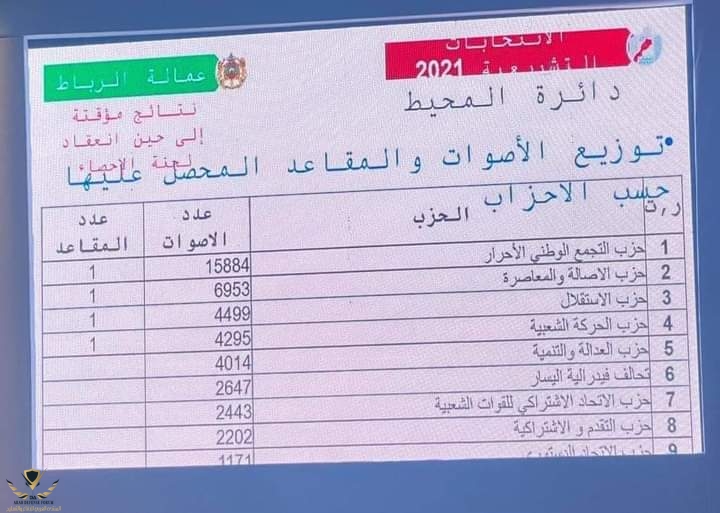 وتشير المعطيات إلى أن المقاعد الأربعة المخصصة لهذه الدائرة تقترب من أن تكون لحزب التجمع الوطني للأحرار بحصوله على 15884 صوتًا، وحزب الأصالة والمعاصرة بـ6953 صوتا، وحزب الاستقلال بـ4499 صوتاً، ثم حزب الحركة الشعبية بـ4295 مقعداً.