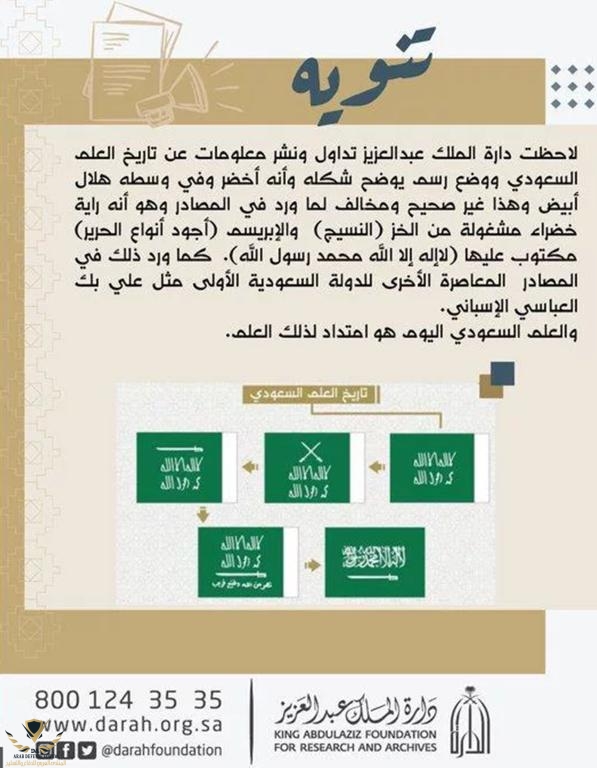 وضح دار الملك عبدالعزيز الأشاعة المنتشرة عن العلم السعودية لدولة السعودية الأولى