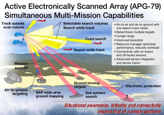 من خلال المسح الإلكتروني النشط - والذي يسمح بتوجيه شعاع الرادار بسرعة الضوء تقريبًا - يعمل الرادار APG-79 على تحسين الوعي الظرفي ويوفر قدرة فائقة على جو - جو وجو - سطح. تسمح الحزمة الذكية للرادار متعدد الأوضاع بالاشتباك كذلك الوقت بحيث يمكن للطيار والطاقم استخدام كلا الوضعين اي وضع البحث و وضع الاشتباك في وقت واحد.