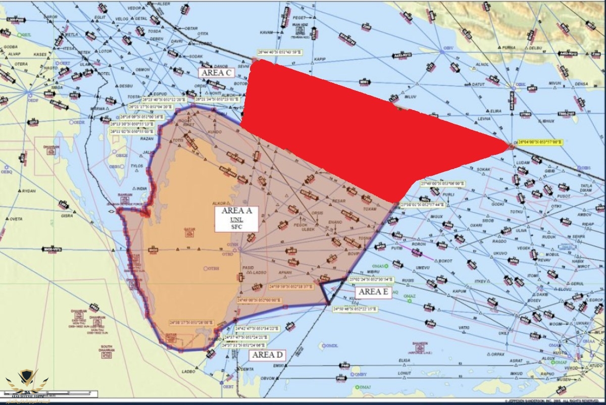 البي واضح ان قطر بتكون ضمن الحدود الاقليميه الايرانيه وانه بتقطع عن البحرين الحدود الجويه