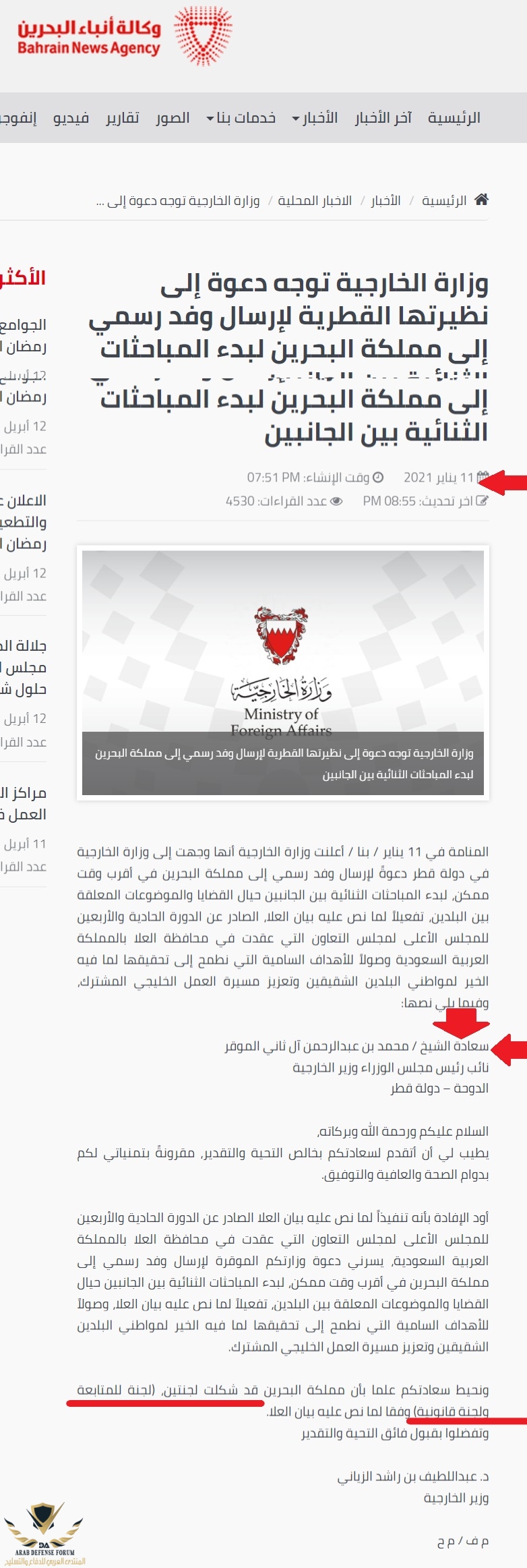 ((وقال سعادة وزير الخارجية إن مملكة البحرين، التزامًا منها بما نص عليه بيان قمة العلا، وانطلاقًا من نواياها الطيبة تجاه الأشقاء، وجهت إلى سعادة الشيخ محمد بن عبدالرحمن آل ثاني، نائب رئيس الوزراء وزير الخارجية في دولة قطر، دعوتين رسميتين لإرسال وفد قطري لعقد المباحثات الثنائية بين البلدين في مملكة البحرين لتسوية الموضوعات والمسائل العالقة بين الجانبين، تنفيذًا لما نص عليه بيان قمة العلا، والمضي قدمًا في تعزيز مسيرة التعاون الخليجي المشترك والحفاظ على تماسك مجلس التعاون لدول الخليج العربية.))