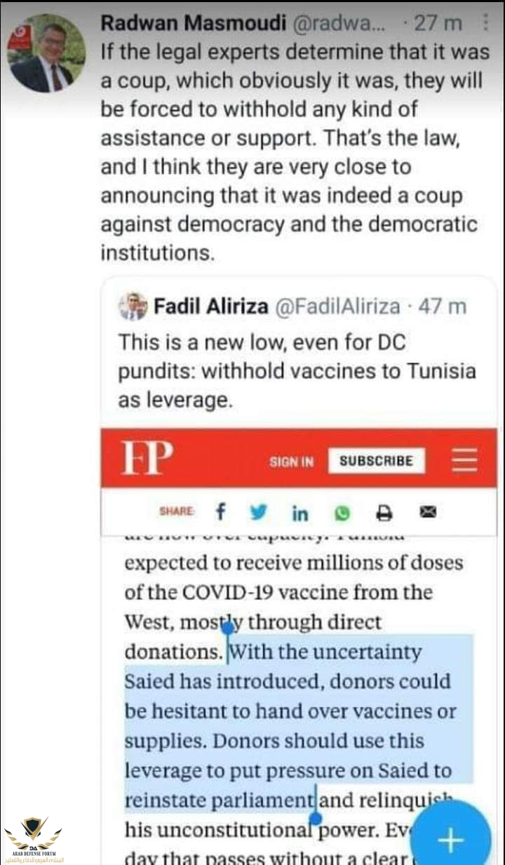 عضو المكتب السياسي لحركة النهضة الإخوانية يطالب الدول الغربية بوقف إمداد تونس بلقاح الكوفيد عقابا لقيس سعيد وانتصارا للديمقراطية.