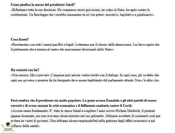 قال رئيس حركة النهضة راشد الغنوشي إن "تونس والاتحاد الأوروبي وتحديدا إيطاليا في مركب واحد وإذا لم تستعيد تونس ديمقراطيتها بأسرع وقت ممكن فسوف ننزلق إلى الفوضى"، وكان ذلك في حوار له مع صحيفة كورييري الإيطالية corriere della sera.