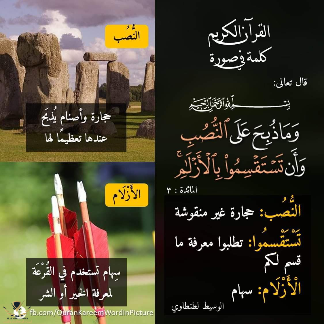 التفسير الميسر: وحرَّم الله عليكم ما ذُبِح لغير الله على ما يُنصب للعبادة من حجر أو غيره، وحرَّم الله عليكم أن تطلبوا عِلْم ما قُسِم لكم أو لم يقسم بالأزلام، وهي القداح التي كانوا يستقسمون بها إذا أرادوا أمرًا قبل أن يقدموا عليه
