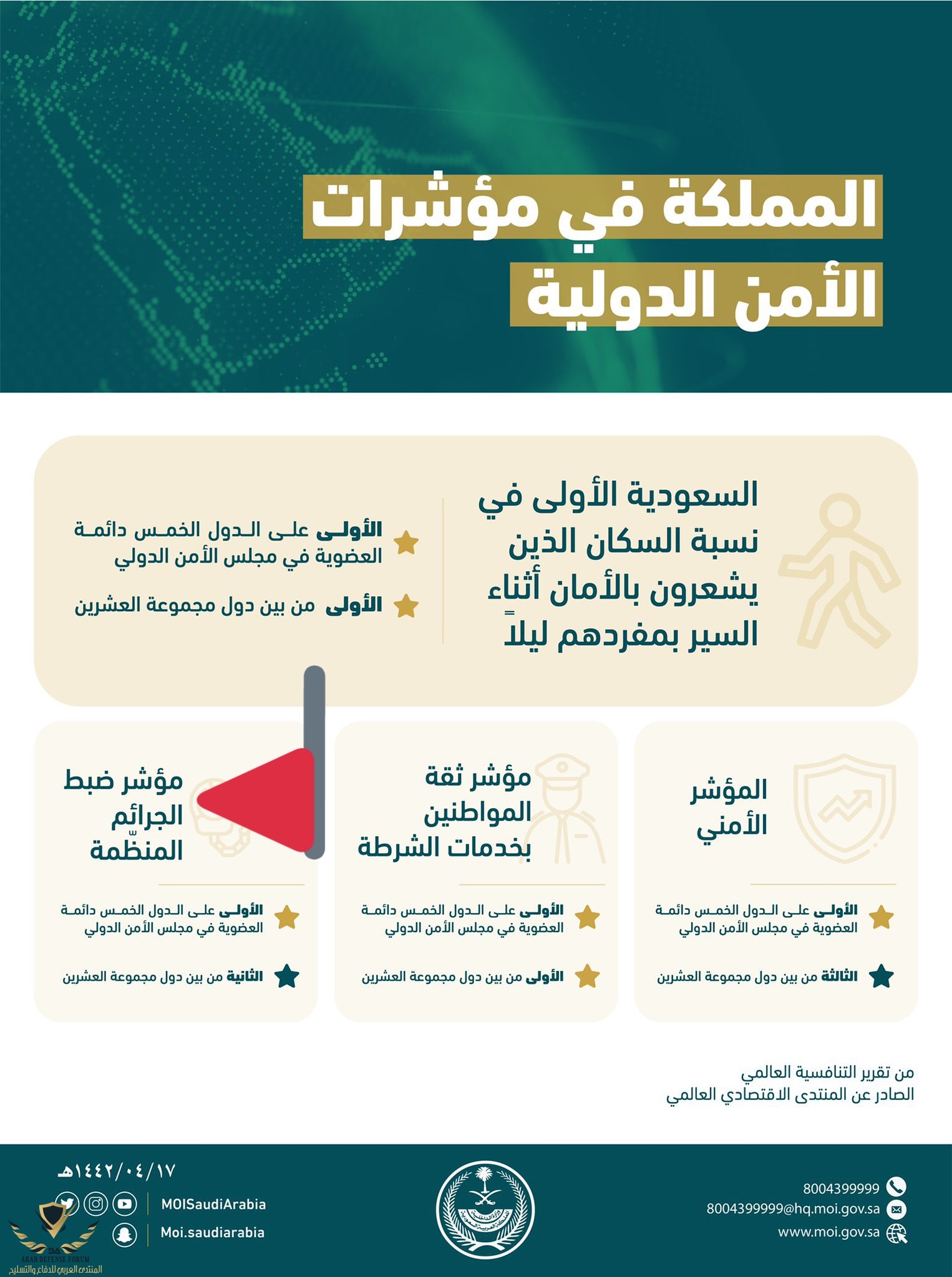السعودية تحقق المركز الاول من بين دول مجموعة العشرين في نسبة السكان الذين يشعرون بالامان اثناء السير بمفردهم ليلاً