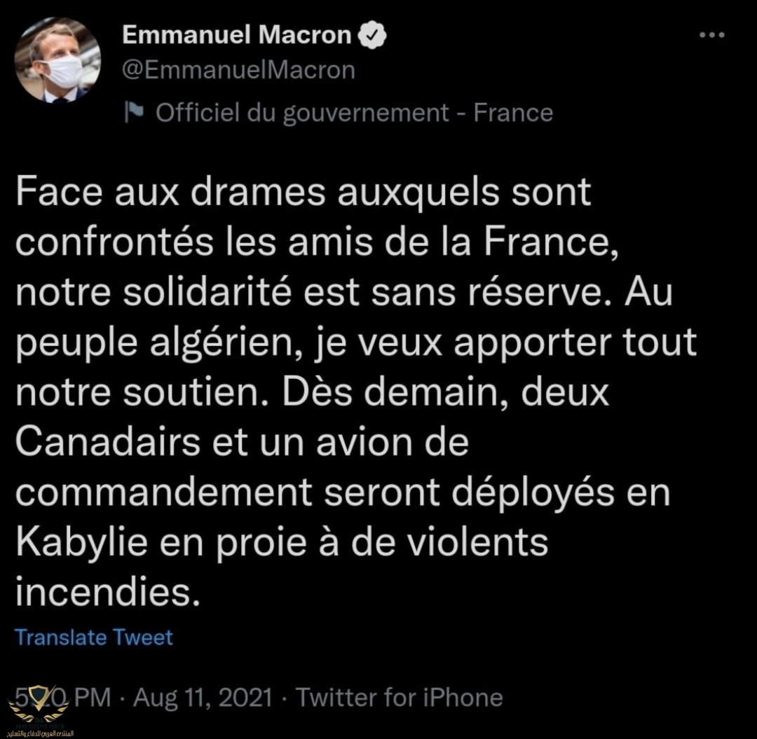 ماكرون اعلن انه سيرسل طائرتين كمساعدة وفعلا وصلت طائرتين فرنسيتين لإطفاء الحرائق و حكومتك تقول كراء فمن نصدق؟؟؟