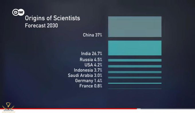 الالمانية: https://youtu.be/-ePZ7OdY-Dw ستقدم المملكة العربية #السعودية للحضارة العالمية 3% من علماء العالم في عام 2030 . 37% من الصين 26.7% من الهند 4.5 % من روسيا 4.2% من اندونيسا 3% من السعودية 1.4% من ألمانيا 0.8 من فرنسا