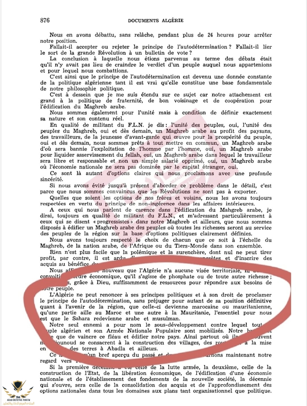 لا يمكن للجزائر أن تتخلى عن مبادئها السياسية وحقها في إعلان مبدأ تقرير المصير ، دون المساس بموقفها النهائي من مستقبل المنطقة ، سواء أصبحت مغربية أو موريتانية ، سواء ذهب جزء إلى المغرب وآخر إلى موريتانيا ، الشيء الرئيسي بالنسبة لنا هو أن تصبح الصحراء عربية ومسلمة مرة أخرى.
