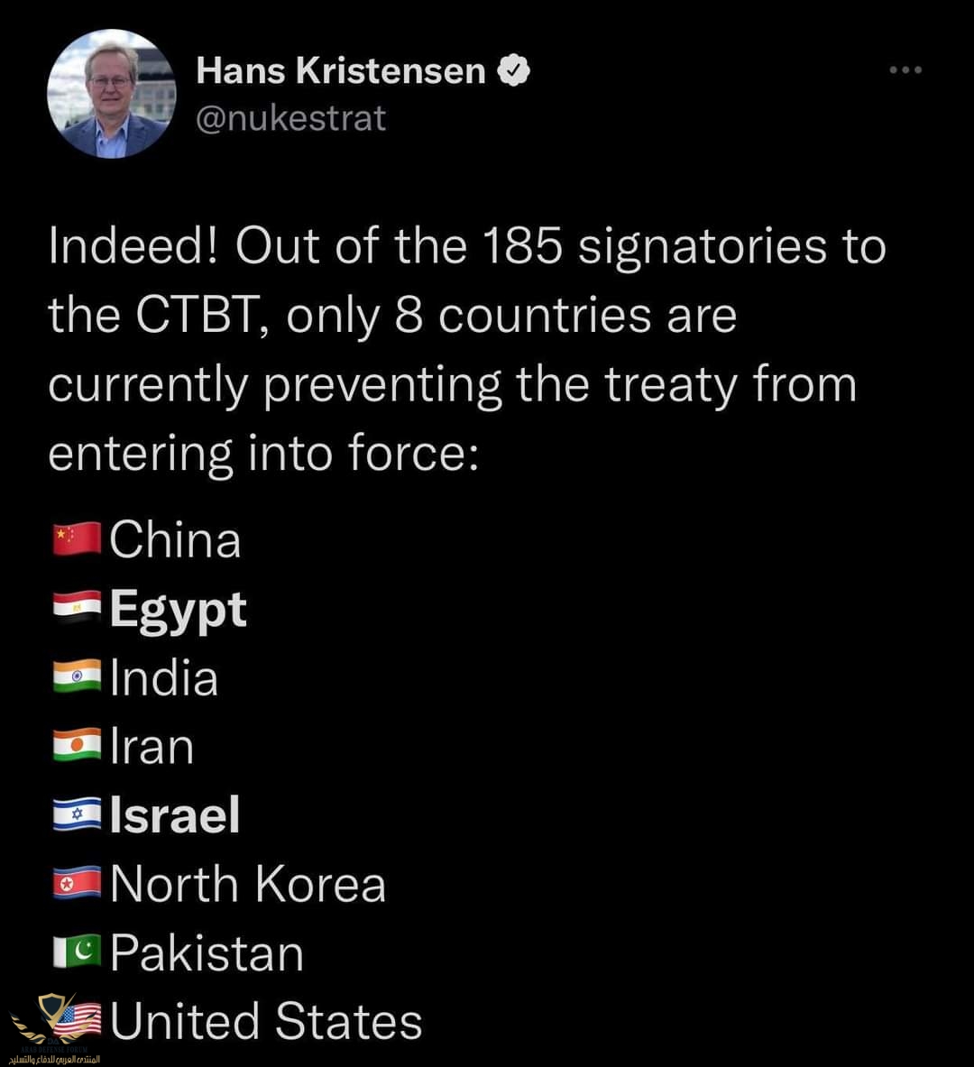 الدول هي "الصين ، مصر ، الهند ، ايران ، اسرائيل ، كوريا الشمالية ، باكستان ، امريكا" ، يذكر ان مصر انسحبت بالفعل من اتفاقية "منع انتشار السلاح النووي" في عام 2015 ، الرئيس السيسي ايضا في حوار تلفزيوني عام 2015 لمح عن امتلاك مصر قوة غير معلومة تحقق التوازن مع الدول النووية