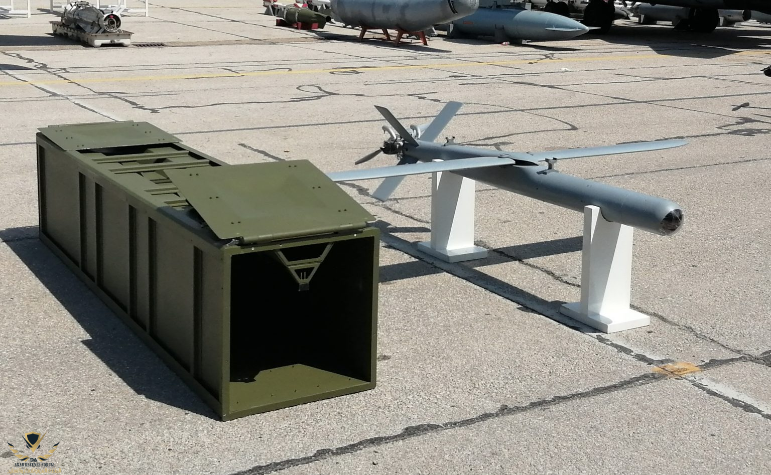 أبعاد الطائرة بدون طيار - الطول 2.2 متر ، جناحيها 2.4 متر والارتفاع مع الداعم 0.4 متر. يتم إطلاق هذه الطائرات بدون طيار من شاحنة إطلاق 4 × 4 بوزن 3.5 طن. عدد الحاويات (الغرف) التي توضع فيها الطائرات بدون طيار