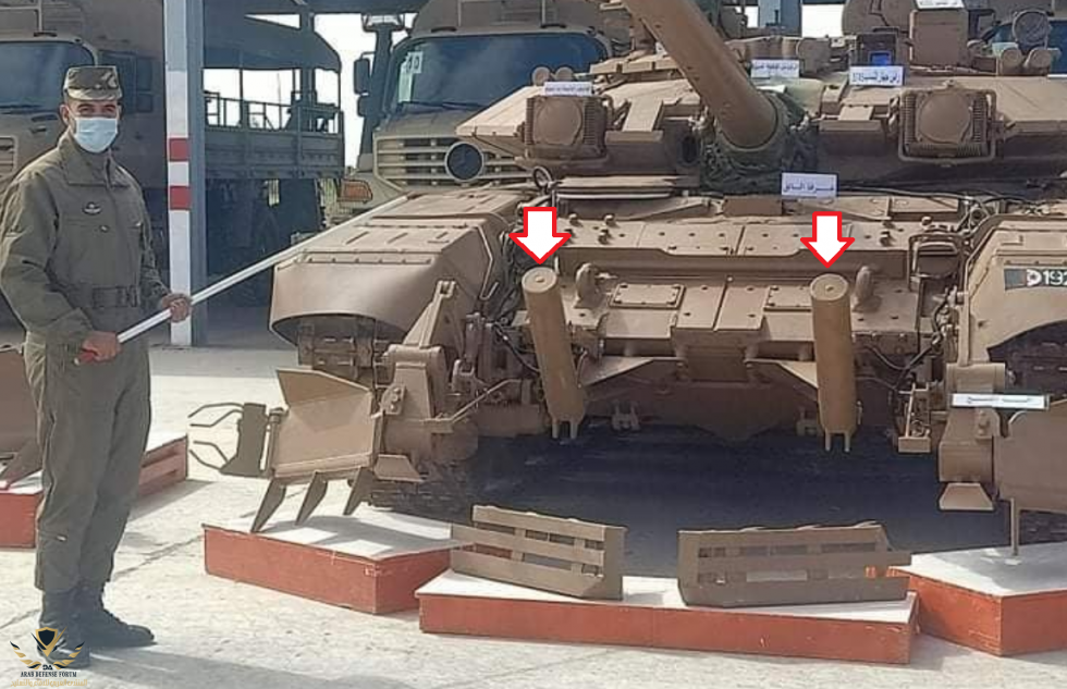 صورة عرضت في الشبكة لدبابة T-90 جزائرية وهي مجهزة بوسيلة لتطهير حقول الألغام، وتحديداً أداة ميكانيكية لإزالة الألغام عن طريق قلعها وجرفها من السطح، أو تفجيرها في موقعها وبالتالي إبعاد خطرها عن طريق جنازير الدبابة. ويمكن ملاحظة الأنصال الشوكية blades التي توضع على جانبي مقدمة هيكل الدبابة وتسمح للعربات الأخرى بمتابعة التقدم خلفها. مع هذه الأداة، الألغام الأرضية المدفونة تتعرض للقلع وتدفع إلى خارج طريق جنازير الدبابة أو يتم قلبها.. مع ذلك، يلاحظ بالصورة وجود ذراعين أو أسطوانتين في مقدمة هيكل الدبابة، فما هو الهدف من وجودهما ؟؟