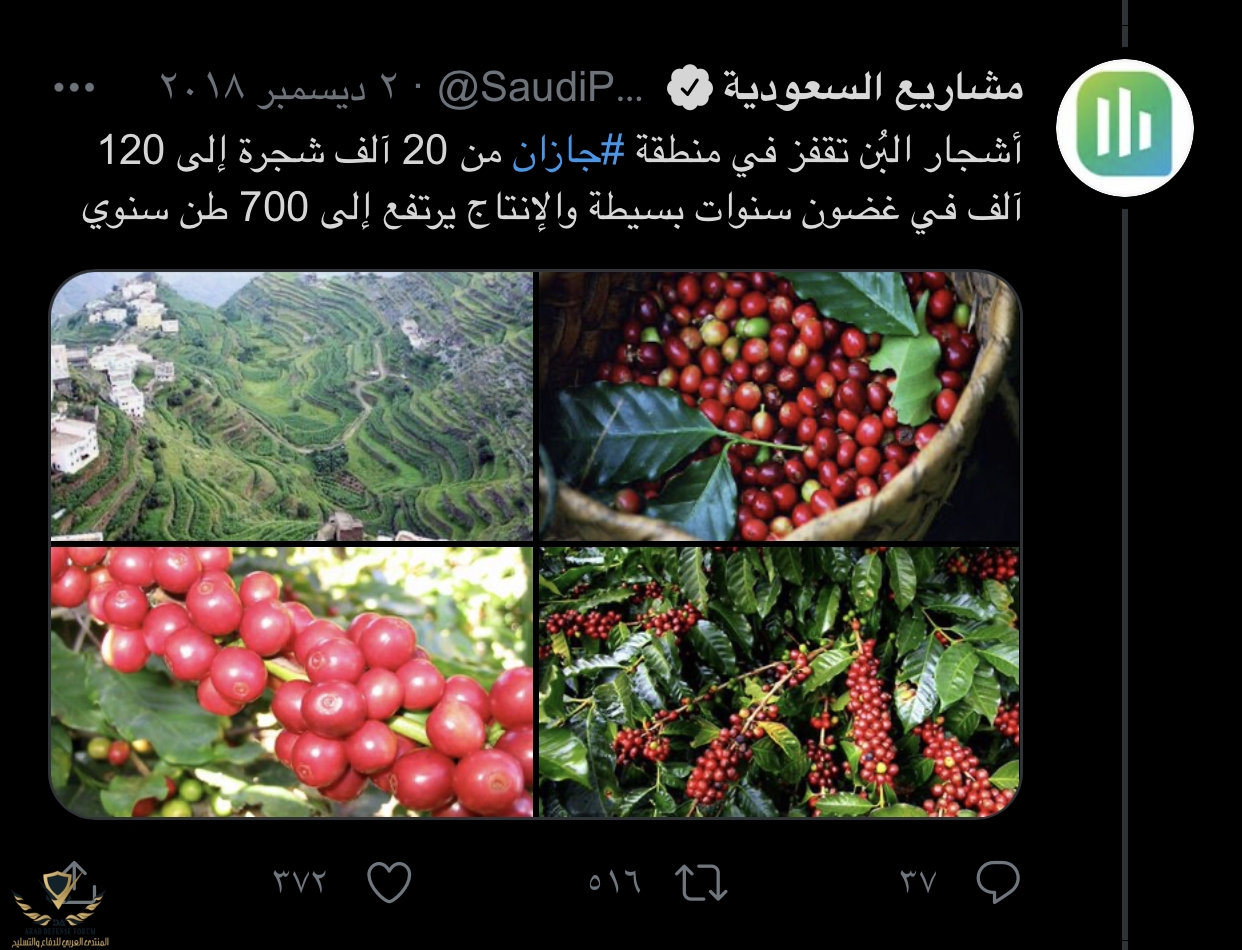 يذكر أن المملكة تعمل على تطوير المحاصيل ذات الميز النسبية واستغلال المياه المتجددة (مياه الامطار)، بهدف دعم المحاصيل ذات العائد الاقتصادي المرتفع ومنها البن.