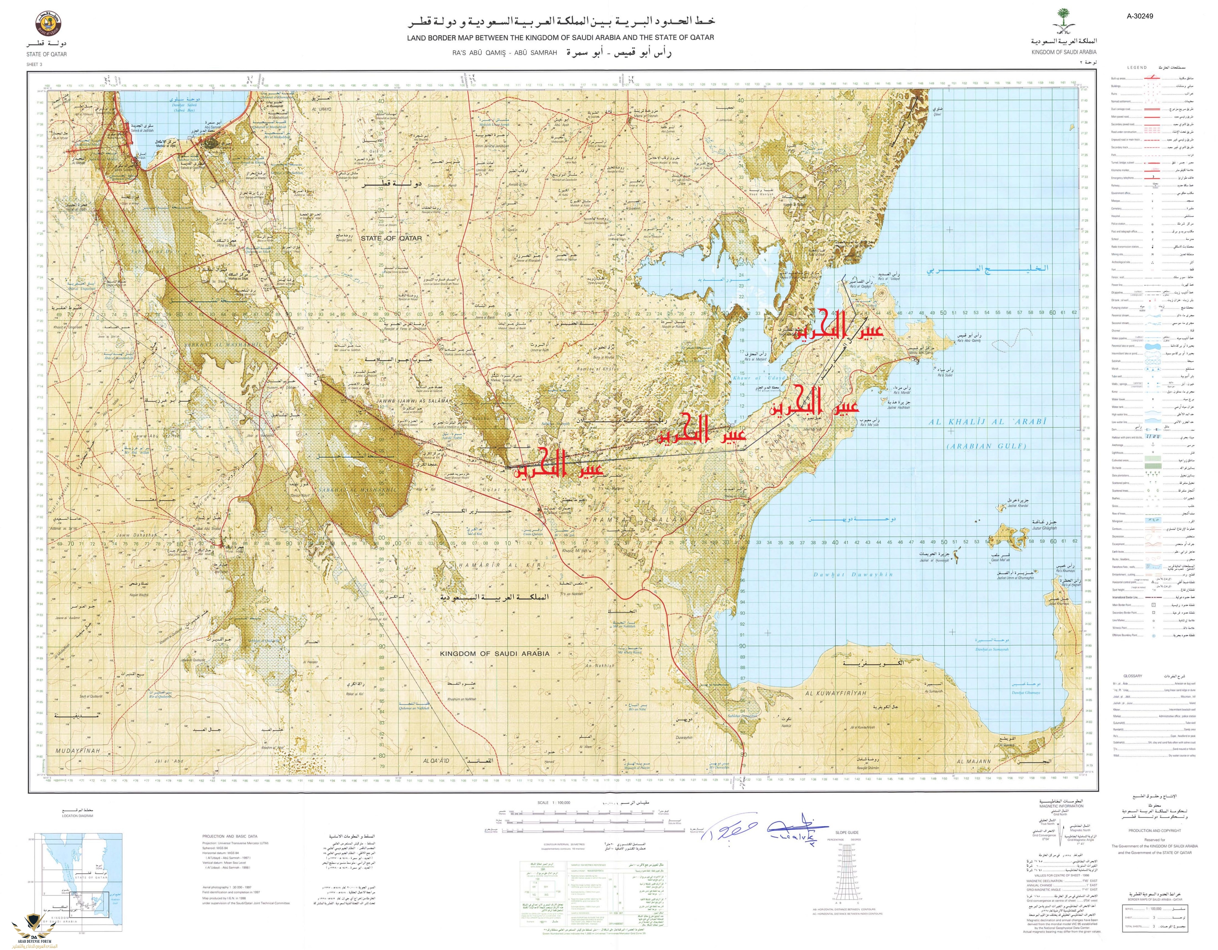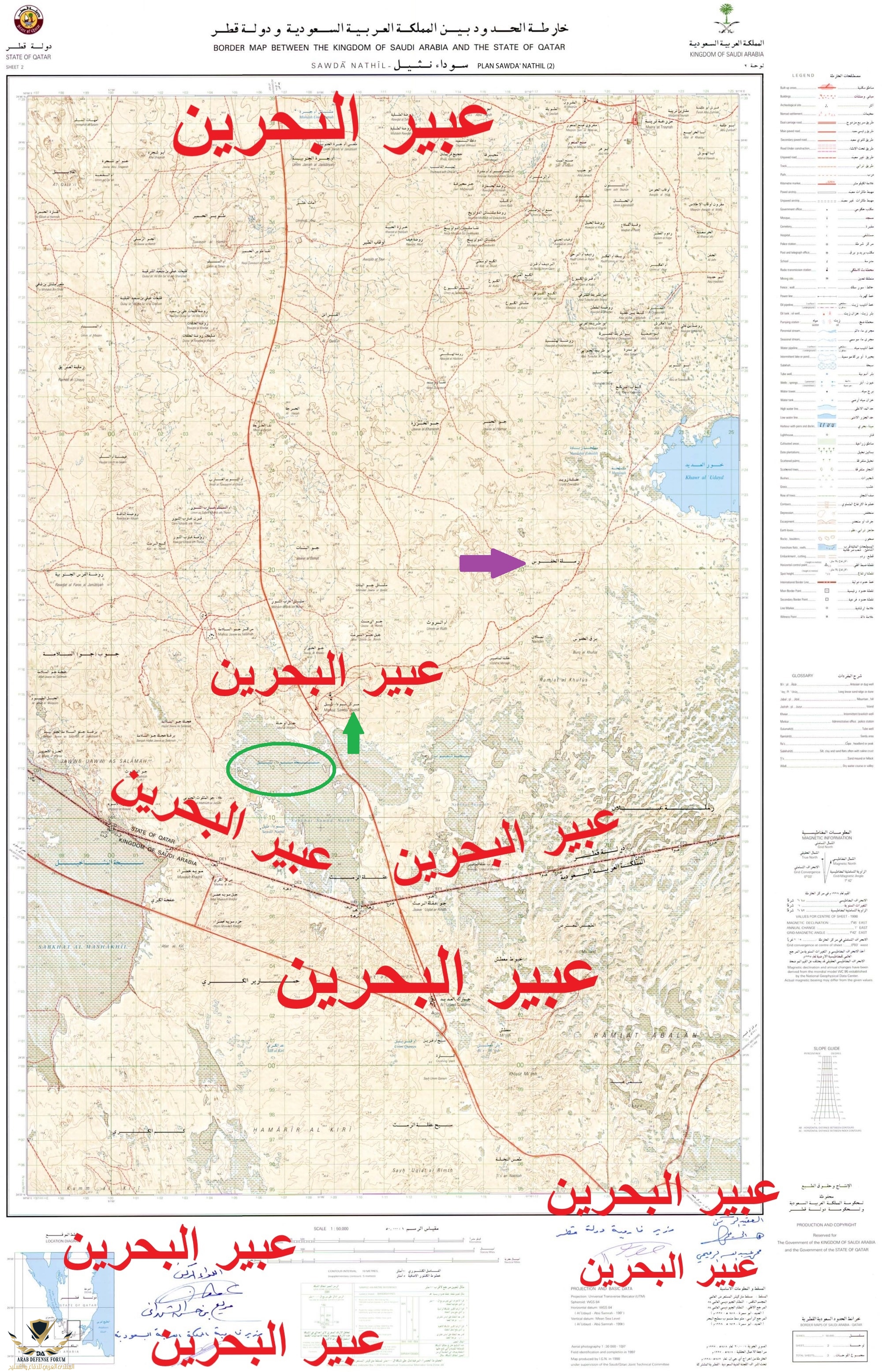 1 - الخريطة موقعة من قبل الأمير نايف بن عبدالعزيز (رحمه الله) وحمد بن جاسم، بتاريخ 2/7/1429 هـ الموافق 6 يوليو 2008م، حيث عقدوا الاجتماع يوم 5 يوليو 2008م وفي هذا اليوم اتفقوا على الصياغة النهائية لترسيم الحدود وفي اليوم التالي تم التوقيع على الخرائط.