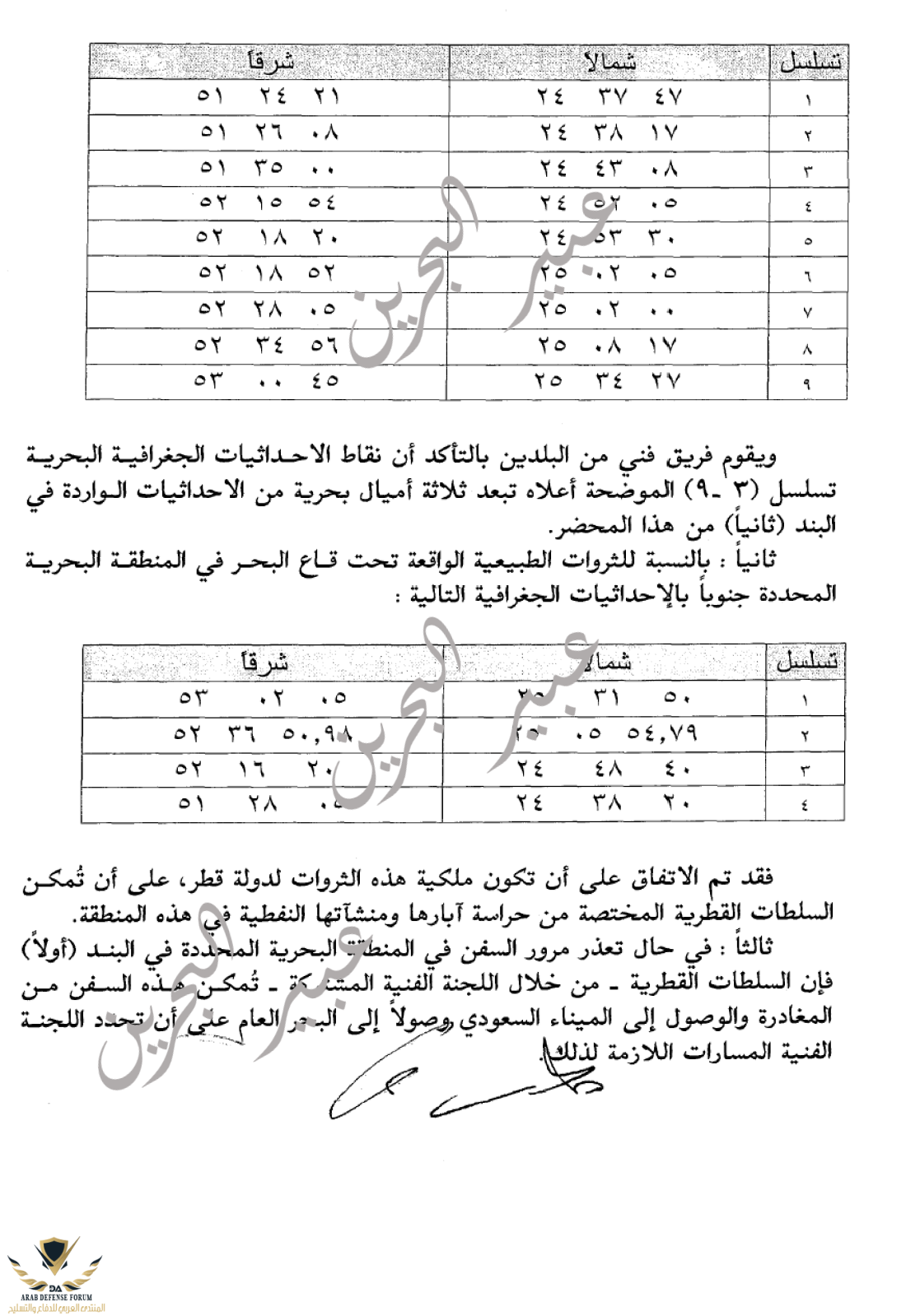 محضر اتفاقية تعيين الحدود البحرية بين المملكة العربية السعودية وقطر لعام 2008 م الموافق 1429 هــ، يتضمن الإحداثيات الجغرافية وموقع من قبل الأمير نايف بن عبدالعزيز آل سعود (رحمه الله) وحمد بن جاسم.