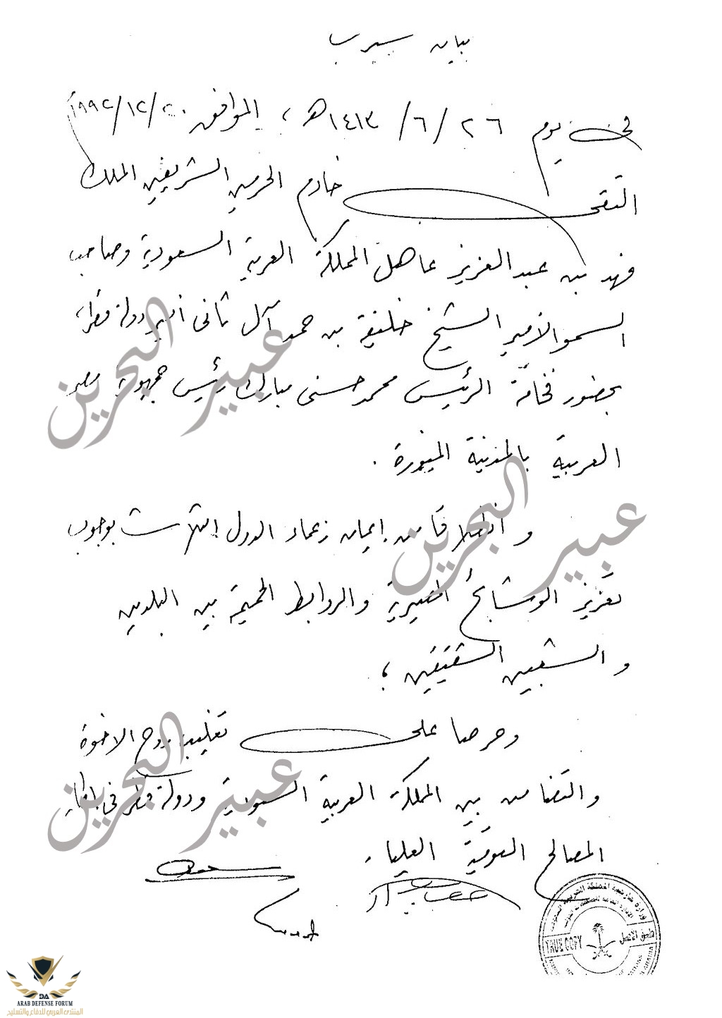 في 20 ديسمبر 1992 حصل اتفاق مبدأي، وكُتب الاتفاق بخط اليد، والوسيط كان المرحوم حسني مبارك حيث قام بزيارة إلى السعودية وقام بدور الوسيط لتحسين العلاقات، والمكان الذي اجتمعوا فيه هو المدينة المنورة،