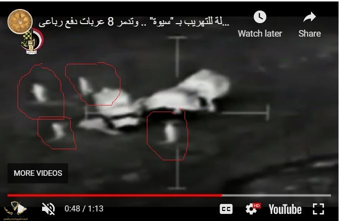 وبعدين لو تركز في فيديوهات الاستهداف اللي الجيش منزلها وبيعلن عنها علي اليوتيوب يعني مش سر ولاحاجه 90% منها الافراد اللي راكبين المركبات دي بيهربوا منها قبل قصفها ودي صور من فيديوهات بتوضح كلامي