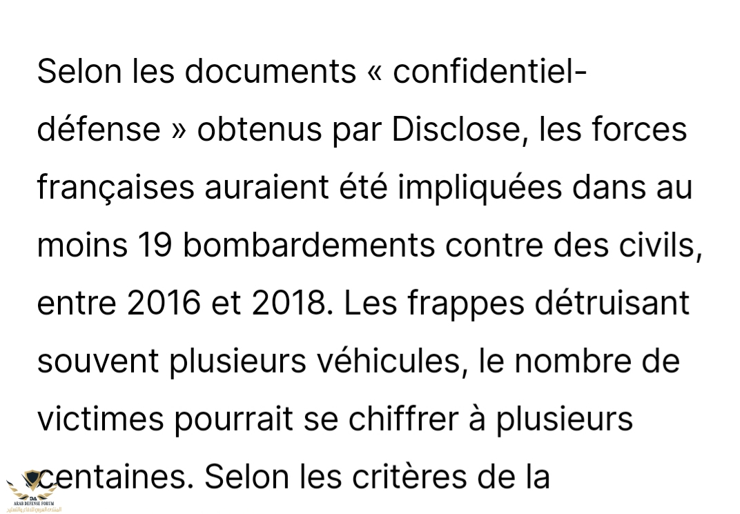 فرنسا هي من امنت الحدود وقامت بكل العمل الاستخباراتي .. وشاركت أيضا ف القصف كما يوضح التقرير قيامها ب ١٩ غارة من ٢٠١٦ ل ٢٠١٨ راح ضحيتها المئات من المدنيين..