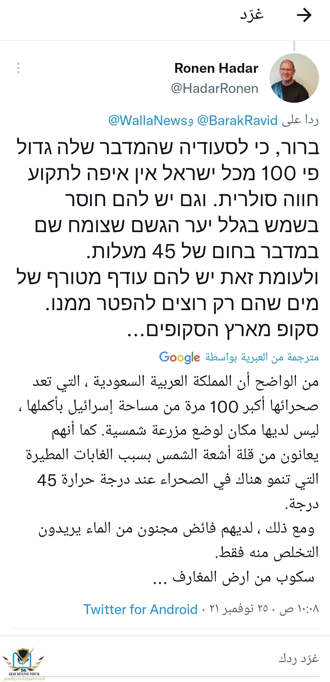 الخفاق الأخضر عضو مميز إنضم 26 مايو 2017 المشاركات 9,981 التفاعل 37,467 956 17 الدولة 25 نوفمبر 2021 #1 ضغطت السعودية على الإمارات لإلغاء اتفاقية "الكهرباء مقابل الماء" مع إسرائيل والأردن والتوقيع على اتفاقية بديلة معها
