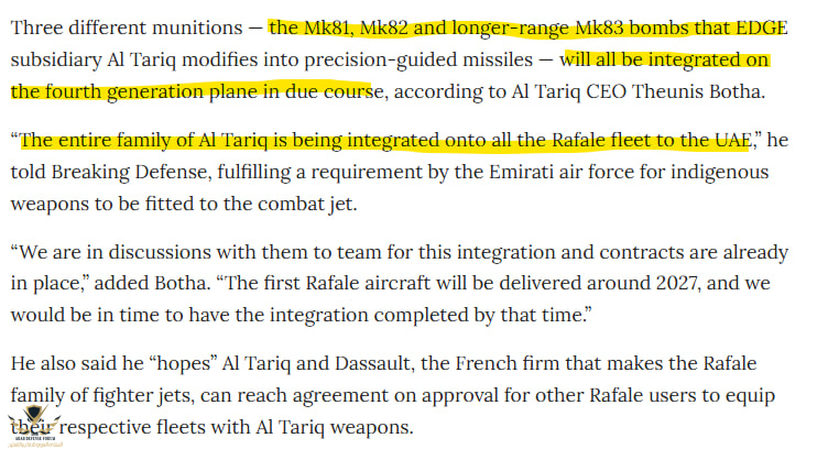 هل يمكن لمصر الحصول ودمج الأسلحة الإماراتية علي المقاتلات المصرية في حالة الإحتياج لها لو تعرضت مصر لحظر الذخائر الغربية عليها أم ان للأسلحة الإماراتية تصنع برخصة ولن تسطيع بيعها لمصر الا بموافقة الدول الغربيةحسب الاتفاقية يمكن دمج ذخائر Mk82، Mk81، و Mk83 التي تنتجها شركة "الطارق" (التابعة لمجموعة إيدج) وهي عبارة عن ذخائر موجهة