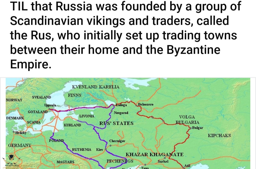 أثناء تصفحي لإحدى صفحات Reddit المتعلقة بالتاريخ وجدت منشور يقول أن روسيا تأسست من قبل مجموعة من الفايكنج والتجار الاسكندنافيين ، تسمى Rus ، الذين أقاموا في البداية مدنًا تجارية بين وطنهم والإمبراطورية البيزنطية.