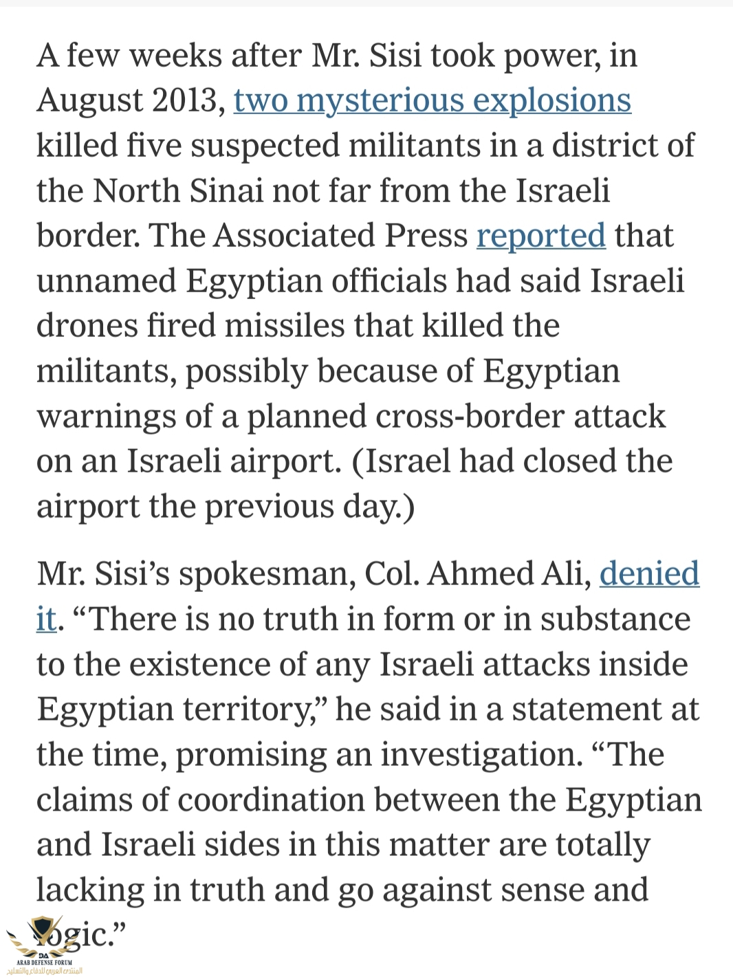 يذكر أن الناطق الرسمي باسم الجيش نفى اي تعاون او تنسيق بين الصهاينة وبين الجيش المصري في 2018 قبل أن يكذبه رئيس الجمهورية قبل أشهر فقط..