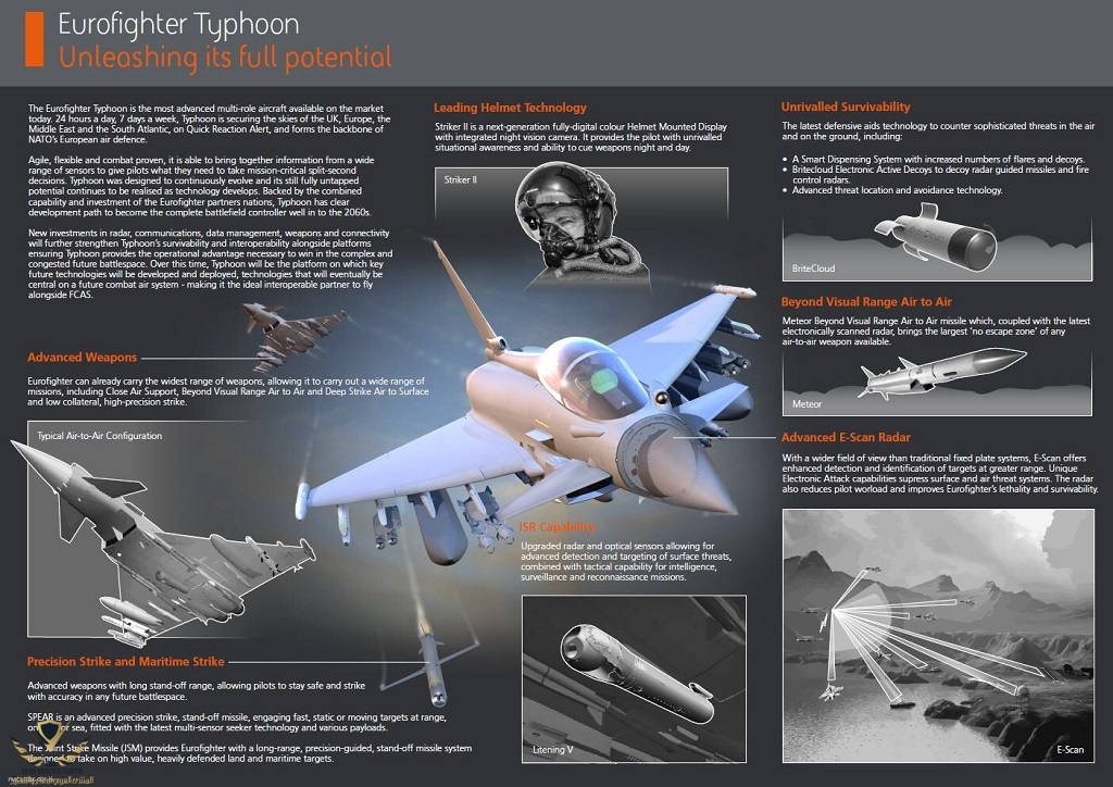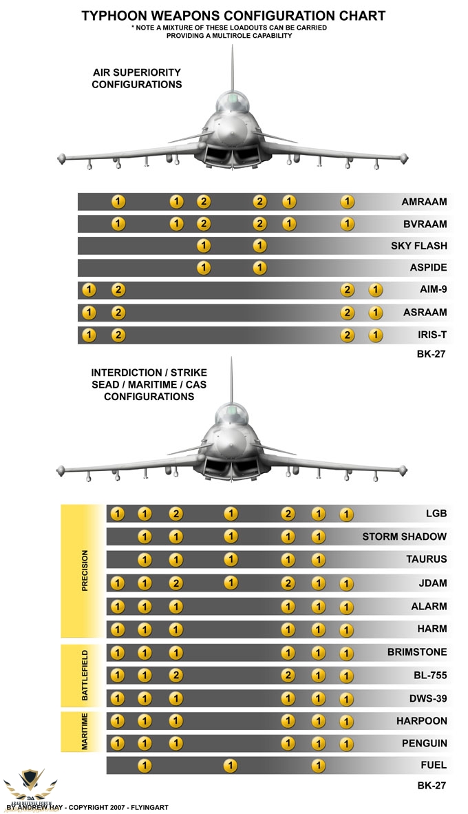 لا ؤريد الدخول في تفاصيل عن الحزم التسليحية و لاكن وجدت مرفقات في النت توضح بشكل مختصر عن الحزم التسليحية للتايفون بشكل عام و المقسمة الي هجوم استراتيجية Strategic attack و تفوق جوي Air Superiority
