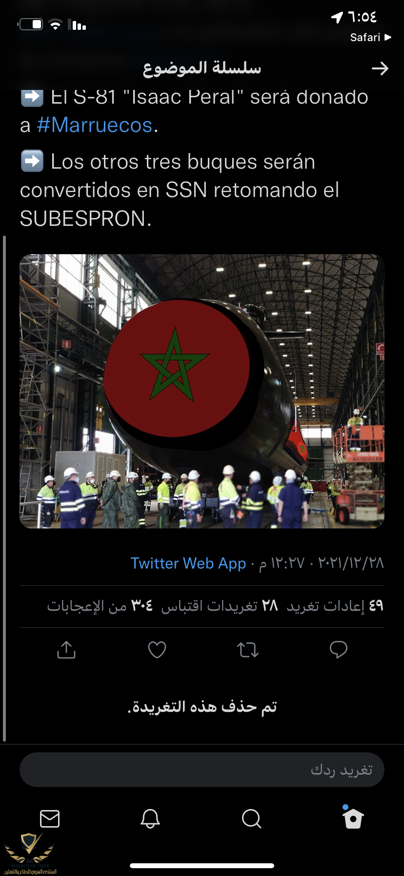 وددت لو إتجه المغرب الشقيق لدولة غير إسبانية في صفقة الغواصات، لأنها تعتبر المغرب العدو الأزلي إلى يومنا هذا، وعليه إن تمت صفقة الشراء سيكون الإسبان ملمين بكل شئ من البصمة الصوتية وغيرها، بالإضافة أن الغواصات تعتبر سلاح إستراتيجي للدول يدخل ما يخصه تحت بند السرية.