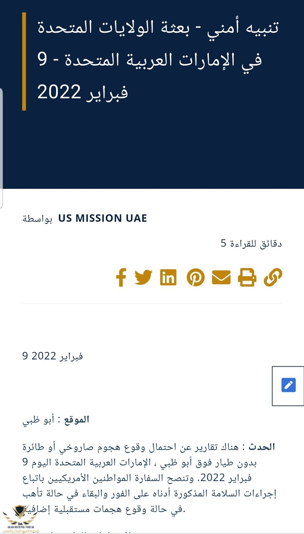 عاجل | السفارة الأمريكية في أبوظبي تحذر الأمريكيين من تقارير عن هجوم صاروخي أو طائرة بدون طيار محتمل فوق المدينة