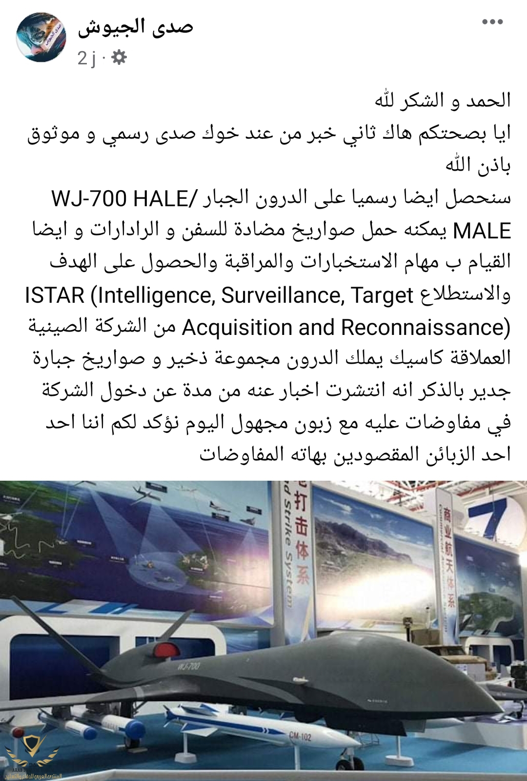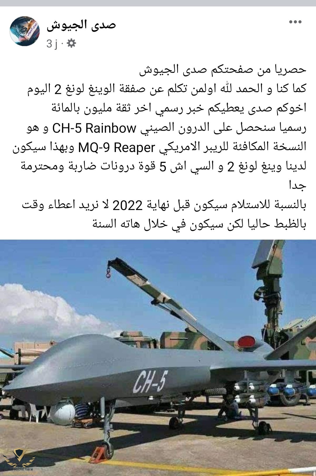 هذا هو المصدر: صفحة فايسبوك مسمي نفسها صدى الجحوش يتابعها 80 ألف شخص و صاحبه عضو في منتدى الصرف الصحي المجاورحساب المنتدى يقول الجزائر تؤكد طلبيه ست طائرات بدون طيار.... ماهو مصدر هذا التأكيد لحساب المنتدى