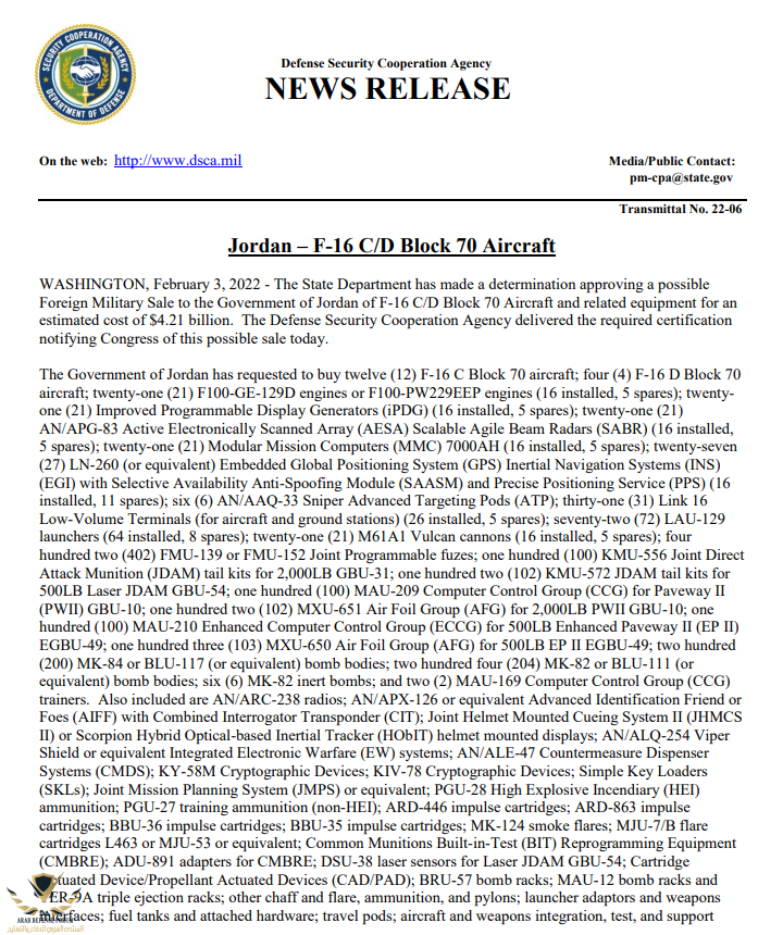 واشنطن ، 3 فبراير 2022 - اتخذت وزارة الخارجية قرارًا بالموافقة على بيع عسكري خارجي محتمل لحكومة الأردن لطائرة F-16 C / D Block 70 ومعدات ذات صلة بتكلفة تقديرية تبلغ 4.21 مليار دولار. قدمت وكالة التعاون الأمني الدفاعي الشهادة المطلوبة لإخطار الكونجرس بهذا البيع المحتمل اليوم.