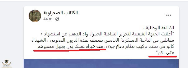 "أعلنت الجبهة الشعبية لتحرير الساقية الحمراء واد الدهب عن استشهاد 7 مقاتلين من الناحية العسكرية الخامس بقصف نفده الدرون المغربي ،