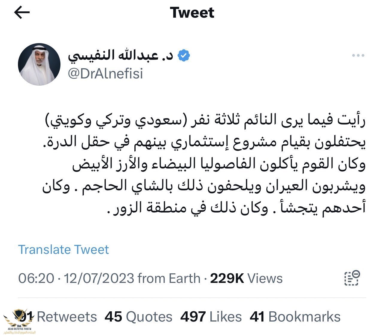 وزارة الخارجية السعودية : ملكية الثروات الطبيعية في المنطقة المغمورة بما فيها حقل الدرة بكامله هي ملك بين المملكة ودولة الكويت فقط ولهما وحدهما كامل الحقوق السيادية لاستغلال الثروات في تلك المنطقة.