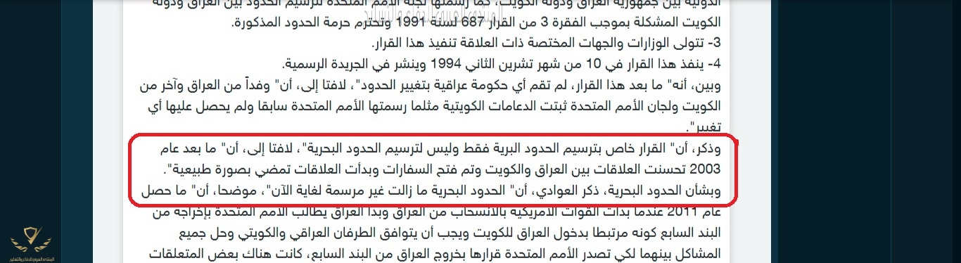 مجلس الأمن لم يرتكب مخالفة قانونية، بل على العكس مجلس الأمن قام بحل إشكالية الحدود البرية الكويتية العراقية مع تثبيت نقاط الساحل بين الكويت والعراق،