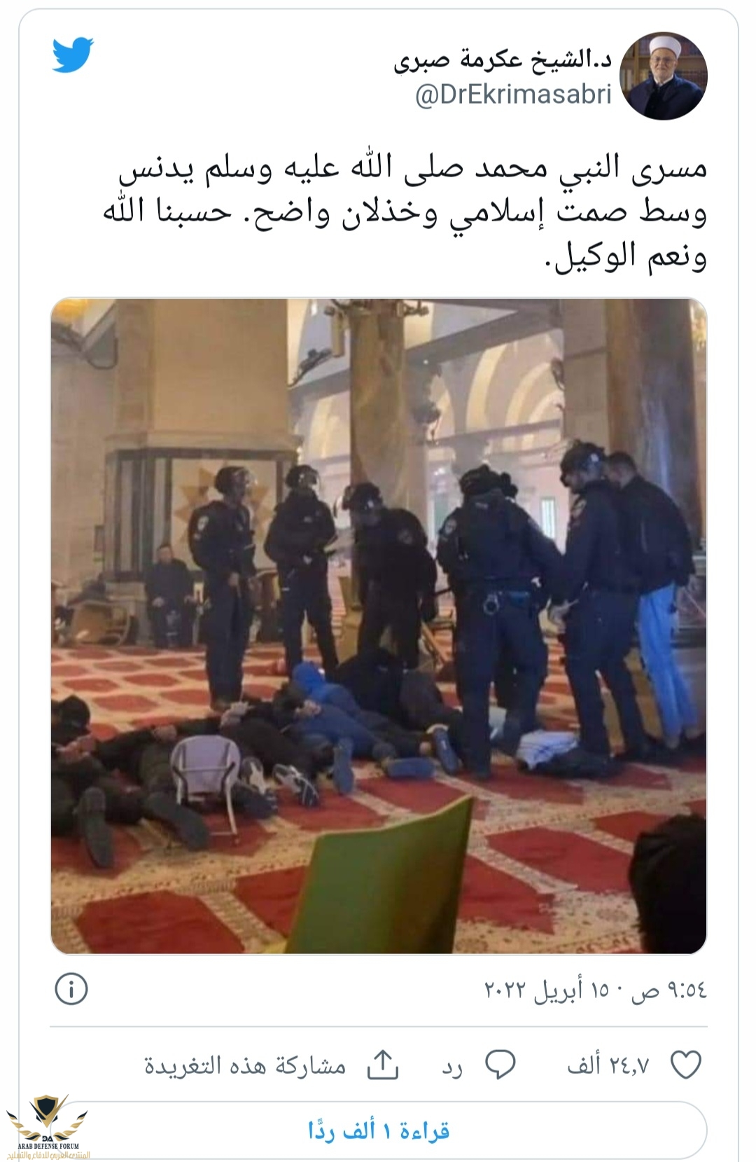 ي ليت يتعلم ربط لسانه ويهتم بشؤون الجهاد هذا شي بينه وبين ربهعزيزي الشيخ عكرمه صبري هو من كان يقود الشبان المقدسيين داخل المسجد الأقصى تعرض للإصابة عدة مرات ودائما يدعو للجهاد والرباط .وأبعد عدة مرات وقاد الشبان بأحداث البوابات الألكترونيه