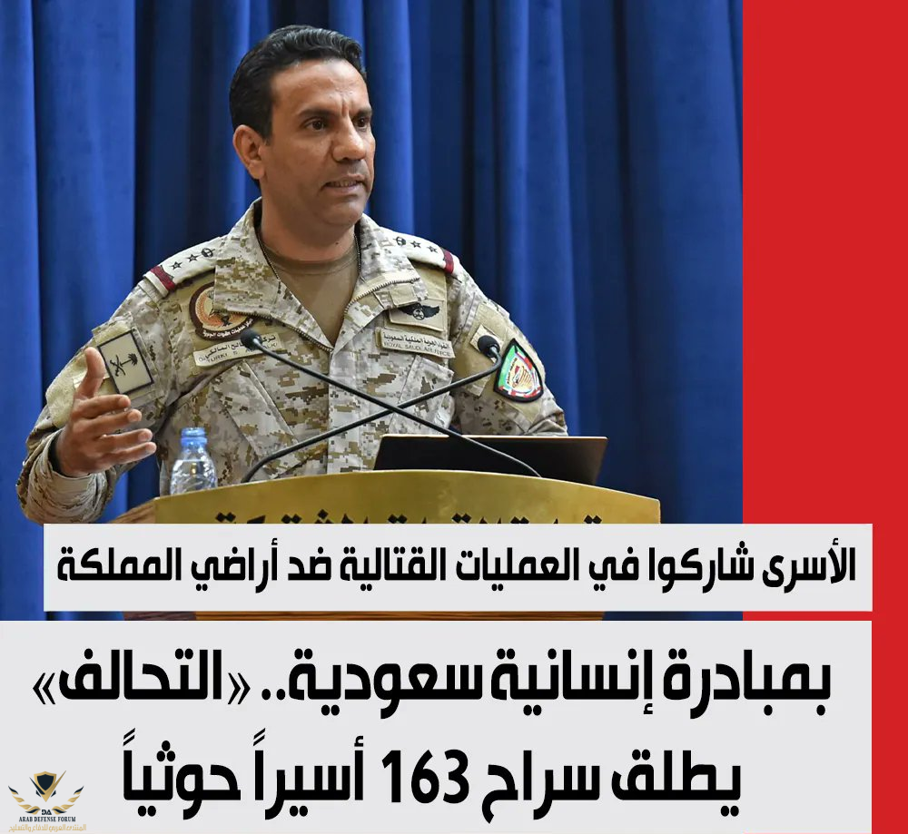 بأن قيادة القوات المشتركة للتحالف ستطلق سراح 163 أسيراً من الأسرى الحوثيين الذين شاركوا بالعمليات القتالية ضد أراضي المملكة