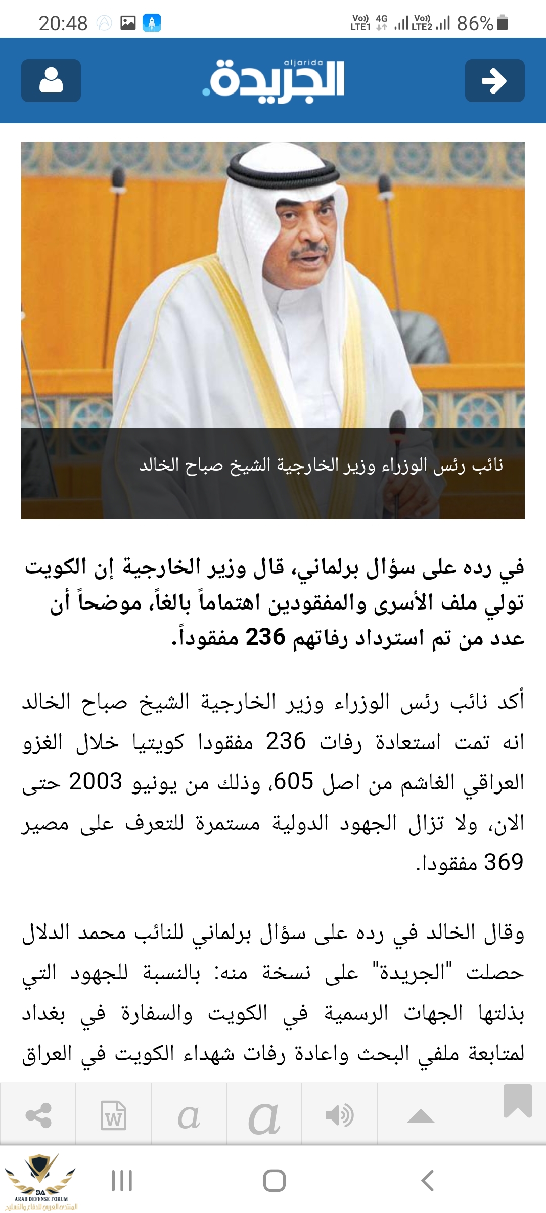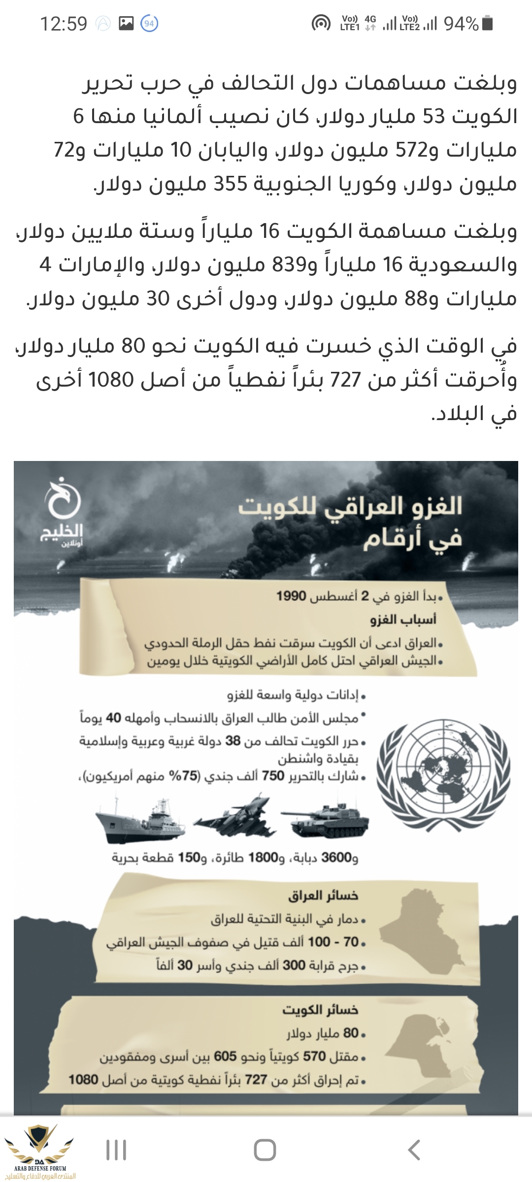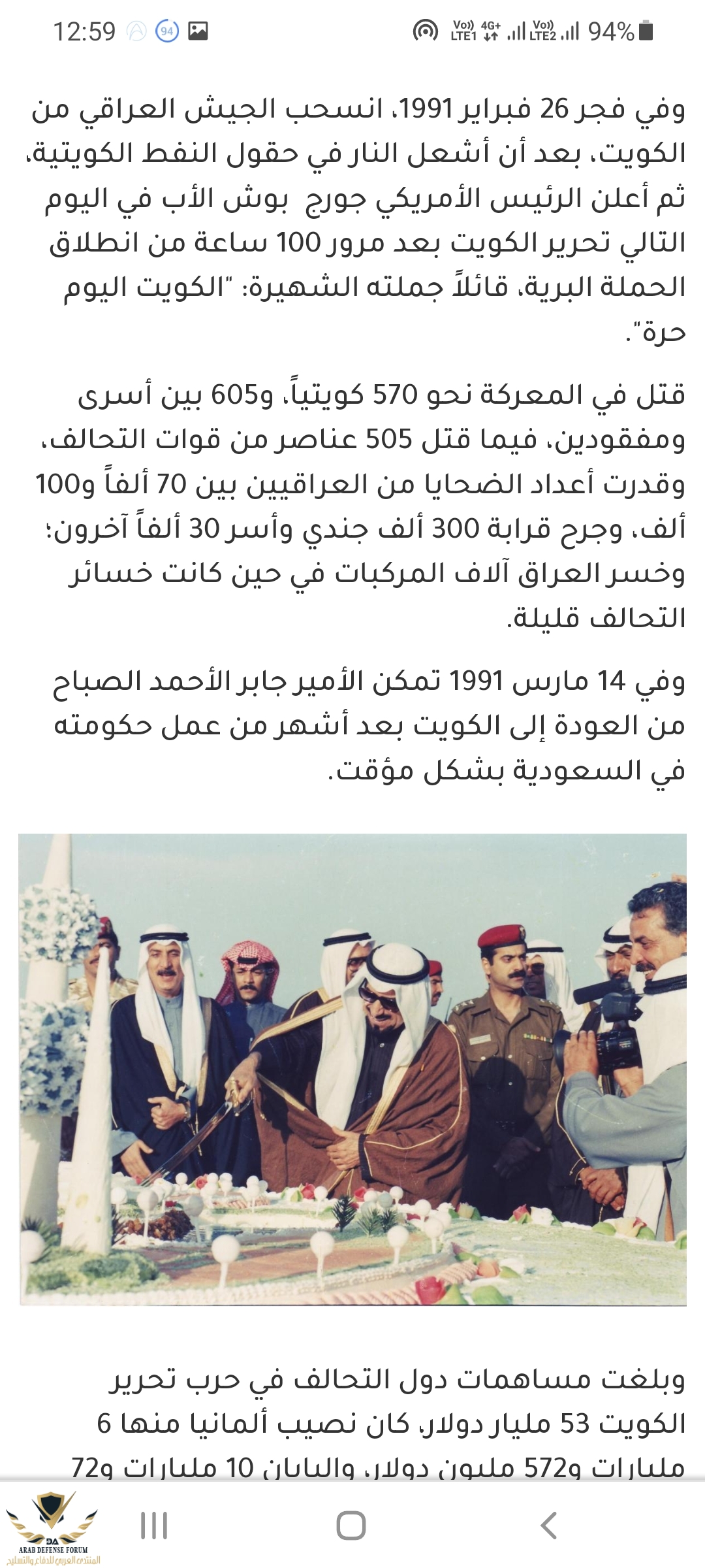 قرأت الكثير من المشاركات و البعض يعتقد بانه الكويت هي نفسها 1990 - 1991، اعتقد مازال عالق في ذاك الزمان،بعد التسعينات وبعد تحرير الكويت خاصتاً الحكومات الخليجية كافة وضعت ميزانية ضخمة في الدفاع وشراء احدث المعدات والاهتمام في المجال العسكري والتدريبي