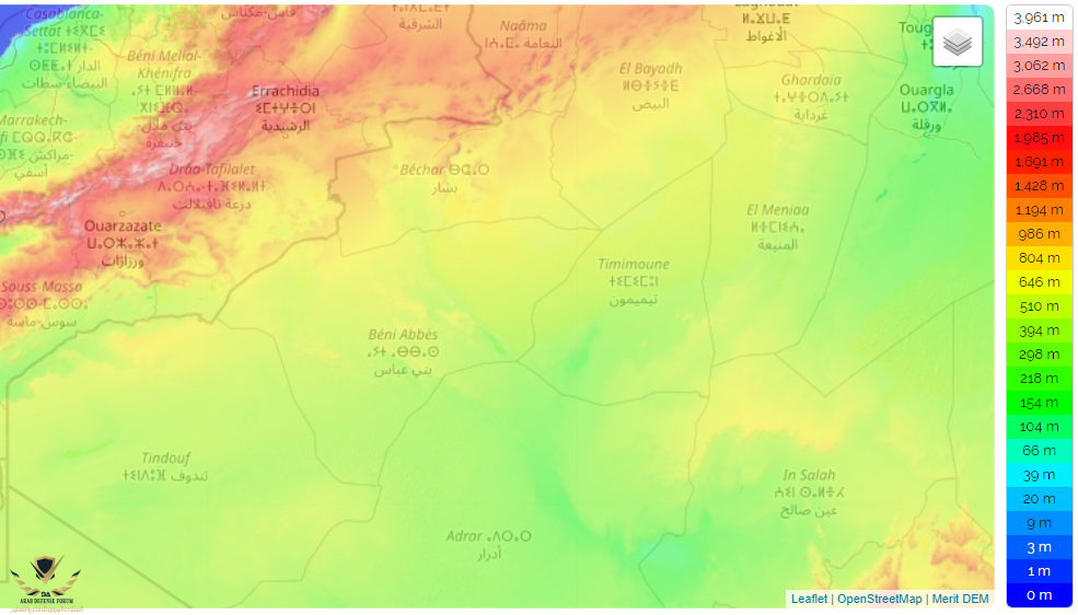 لا تخف ... انظر لهذه الخريطة الطبوغرافية .... ظهر المغرب من ناحية الجزائر كله جبال و مرتفعات عكس ظهر الجزائر للمغرب .... و المناطق االحدودية في الاسفل يقوم المغرب بتطويقها بجدار امني الى جبال الوركزيز ....