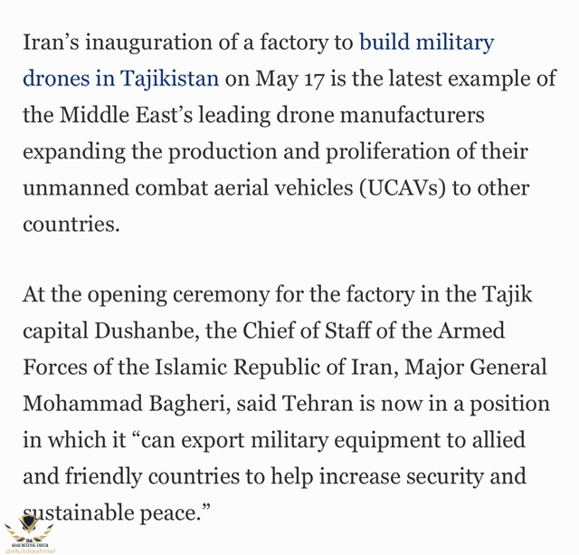 يعد افتتاح إيران لمصنع لبناء طائرات بدون طيار عسكرية في طاجيكستان في 17 مايو أحدث مثال على قيام كبار مصنعي الطائرات بدون طيار في الشرق الأوسط بتوسيع إنتاج وانتشار مركباتهم الجوية القتالية بدون طيار (UCAVs) إلى بلدان أخرى.