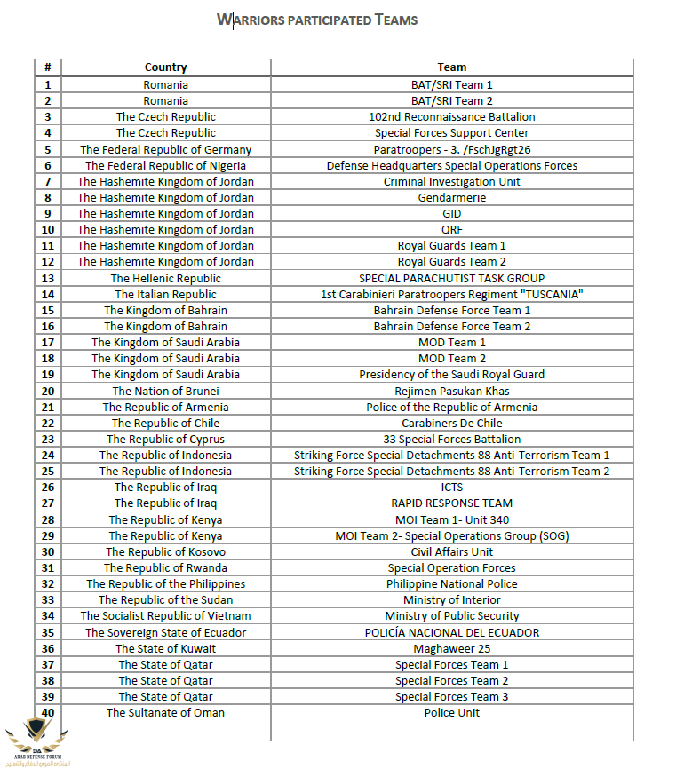 يشار إلى أن مسابقة المحارب السنوية في نسختها الثانية عشر تتنوع فيها صنوف المشاركين في المسابقة من فرق العمليات الخاصة والوحدات العسكرية التقليدية، والأجهزة الأمنية، من دول شقيقة وصديقة.​