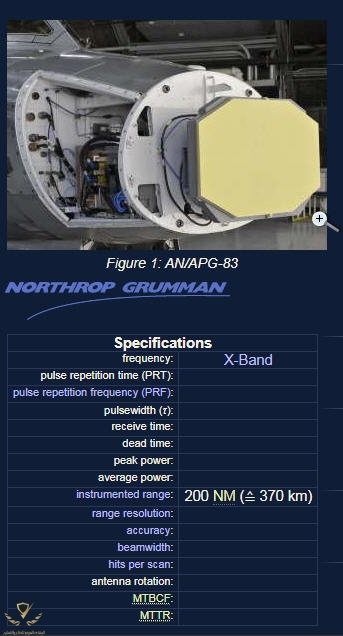 - يتيح رادار المصفوفة الممسوحة ضوئيًا إلكترونياً النشط (AESA) "عرض نطاق ترددي وسرعة وخفة وحركة أكبر" في تتبع واكتشاف وتحديد عدد أكبر من الأهداف جو-جو وجو-أرض مثل رادارات الدفاع الجوي