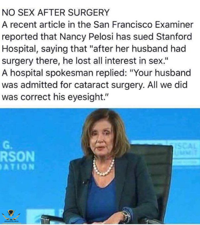 " "رفعت نانسي بيلوسي قضية على مستشفى أجرى عملية لزوجها ، وادعت أن زوجها لم يعد يرغب بها بعد العملية ، وقد ردّ المتحدث باسم المستشفى بأن كل ما فعلوا هو إجراء عملية لتصحيح نظر زوجها