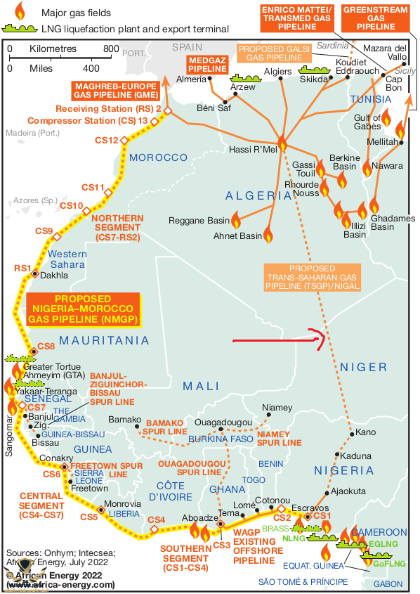وهل يوجد خط يقطع دولتين (النيجر و الجزائر ) بشكل مستقيم في الصحاري الخالية دون الإستفادة منه في توليد الكهرباء و الصناعة ؟! و هل أنبوب المغرب العربي خط مستقيم؟!! الخط سيجاور الطرق الرئيسة بين البلدين من أجل سهولة التدخل في حال الأعطاب و لتوفير الحماية و هذا أمر بديهي لا يحتاج لأن تكون خبير في المحروقات لتعرفه... هذا مجرد رسم توضيحي فقط...انت تعرف احسن من وزارة الطاقة النيجيرية التي ينسق معها وزير بلدك