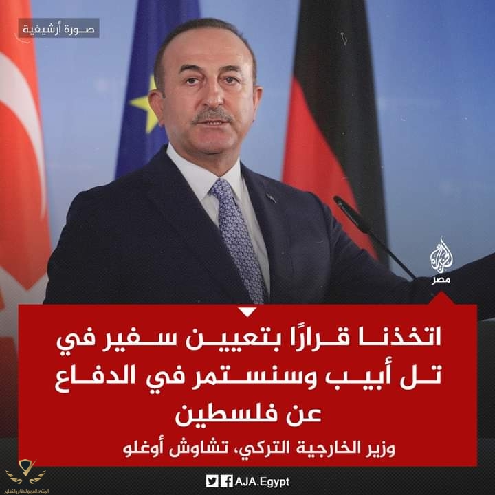 وزير الخارجية التركي تشاوش أوغلو يقول إن بلاده اتخذت قرارًا بتعيين سفير في تل أبيب ومن جهة أخرى ستستمر في الدفاع عن فلسطين والقدس وغزة