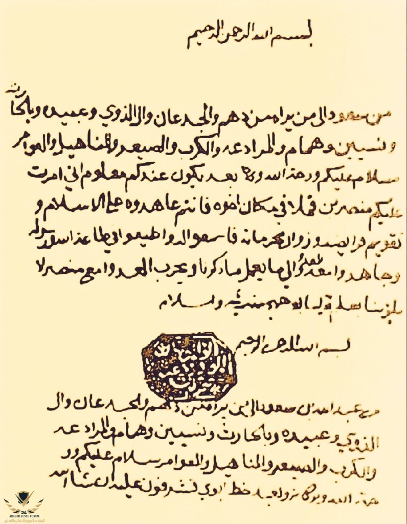 (وردت إلينا برقية من ابن سلطان عطفا لأمر سموكم أننا نعرفكم بعدد القوم وكل بيرق باسمه.. موجودنا أربعة وعشرون بيرقا وباقي القوم بدون بيارق وهذا عموم البيان)