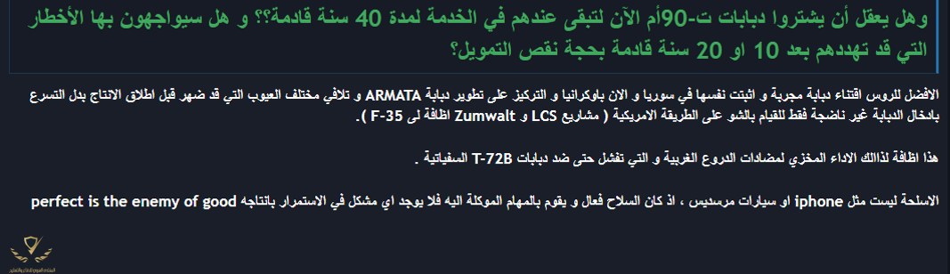 على الاغلب المستويات العليا في الجيش الجزائري تفكر بنفس الطريقة لذلك المغرب محظوظ بوجود خصم بهذا الغباءقد يكون اداء الدروع الروسية كارثي بالنسبة للبعض ولكن بالنسبة لبعض جمهور الدول التي تشغل الدبابات الروسية فاداء مضادات الدروع الغربية هو المخزي والكارثي تبعا لجزائري متعصب للروس بشدة لذلك من الافضل الاستمرار بتشغيل الدبابات الروسية المجربة دون اي تعديل